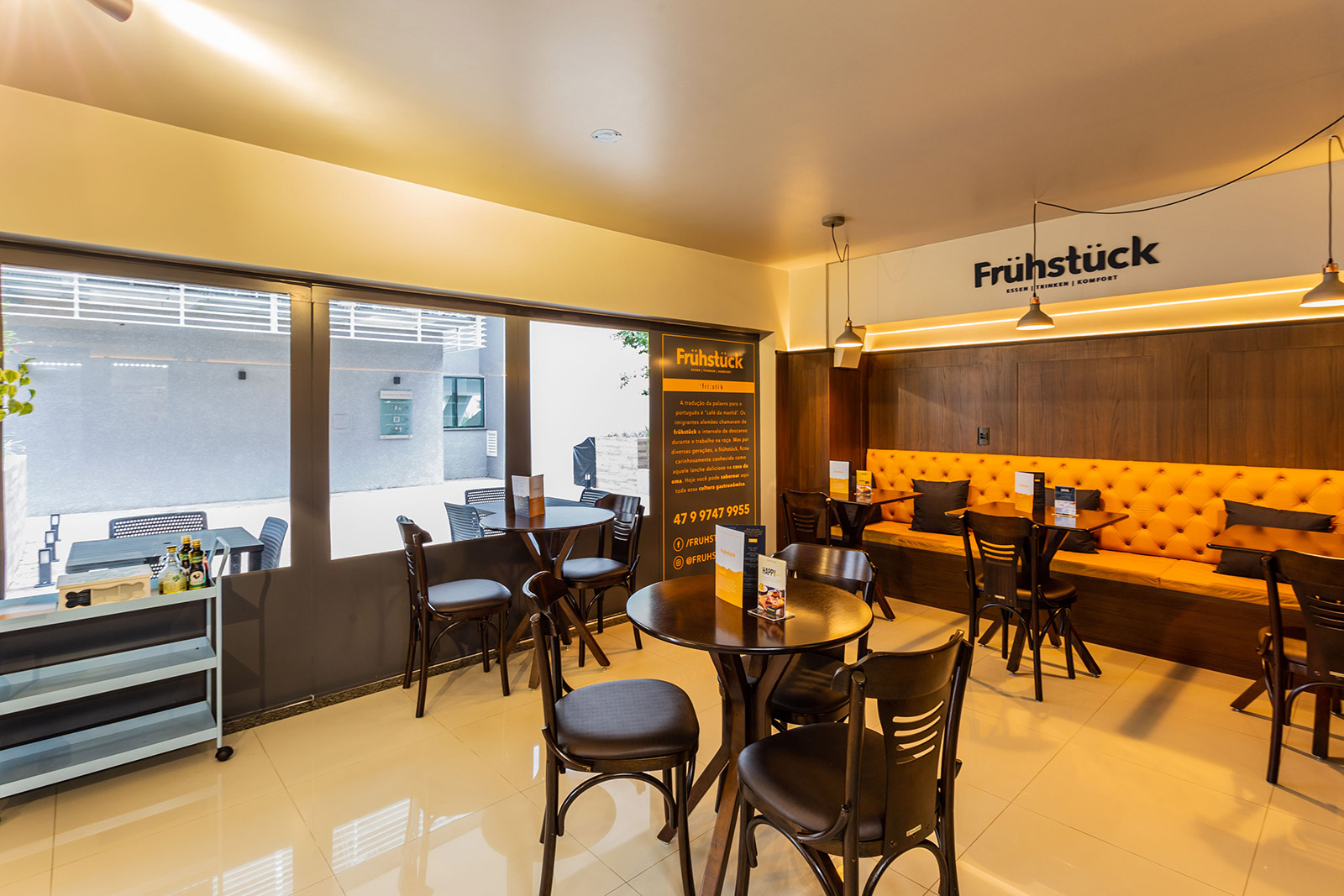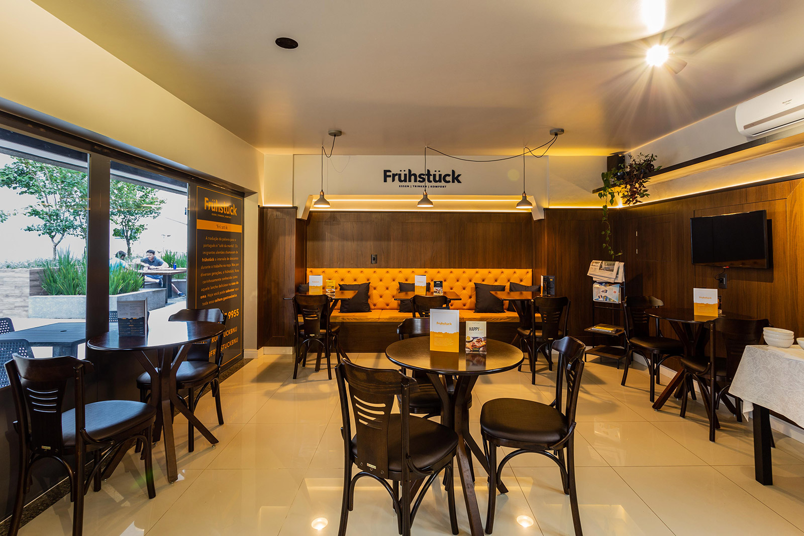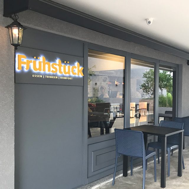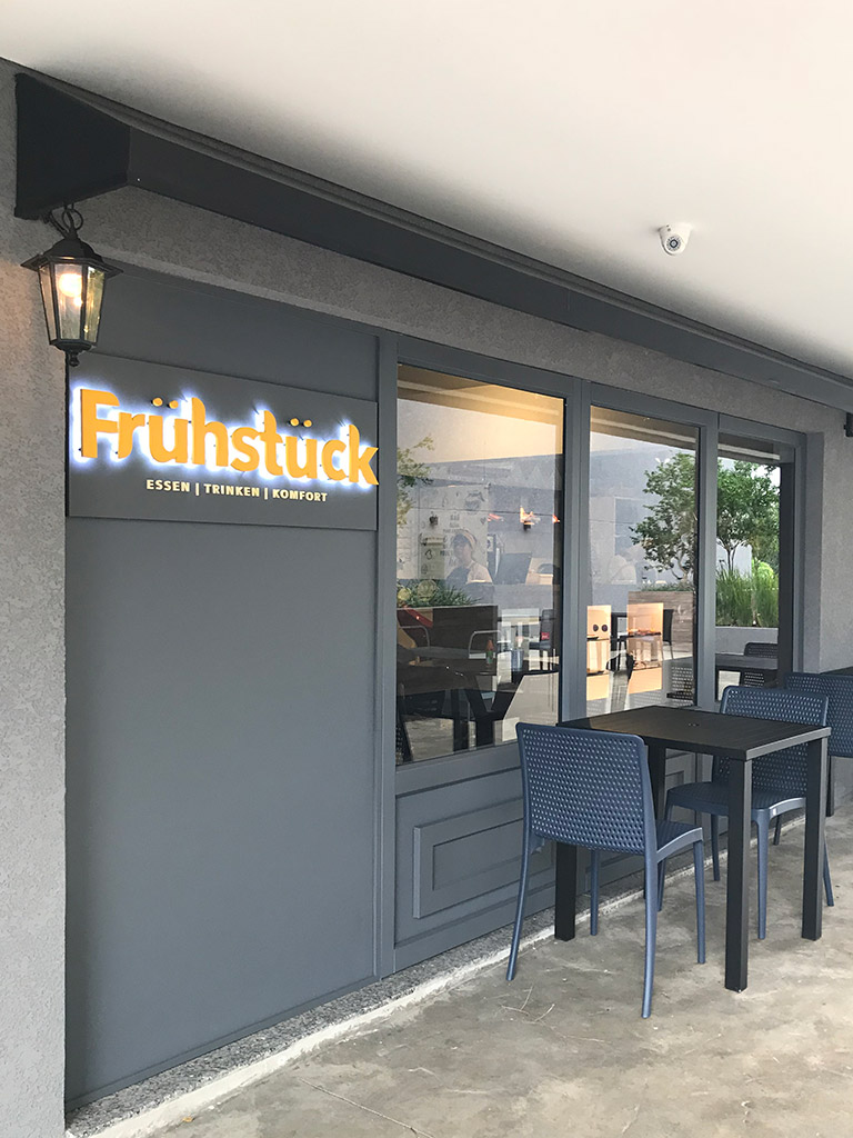 Para remeter aos tradicionais cafés da Europa, combinamos comunicação visual, revestimento criativo, toldos e luminárias na fachada.
