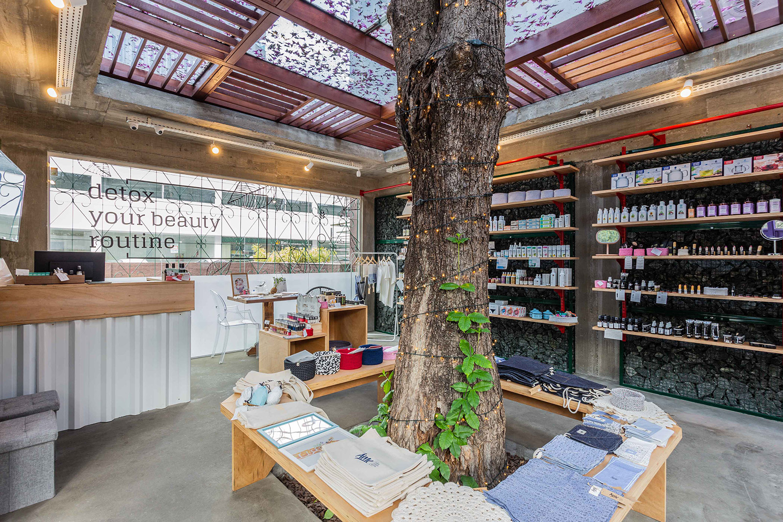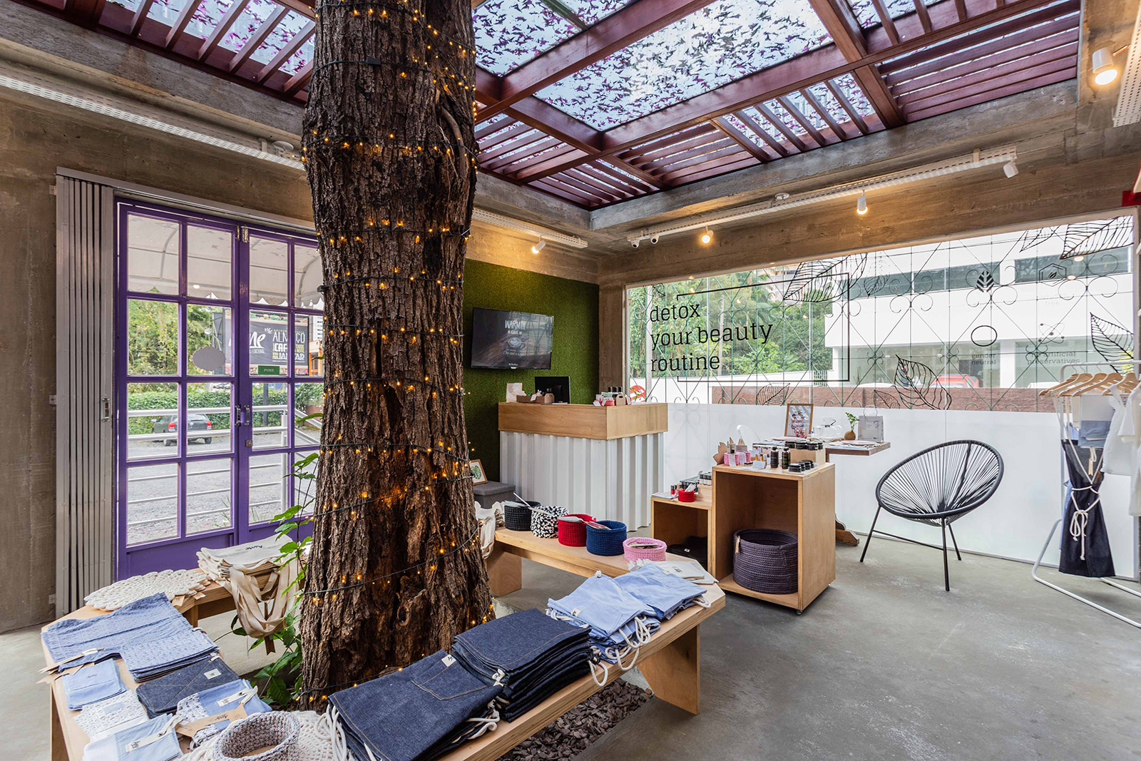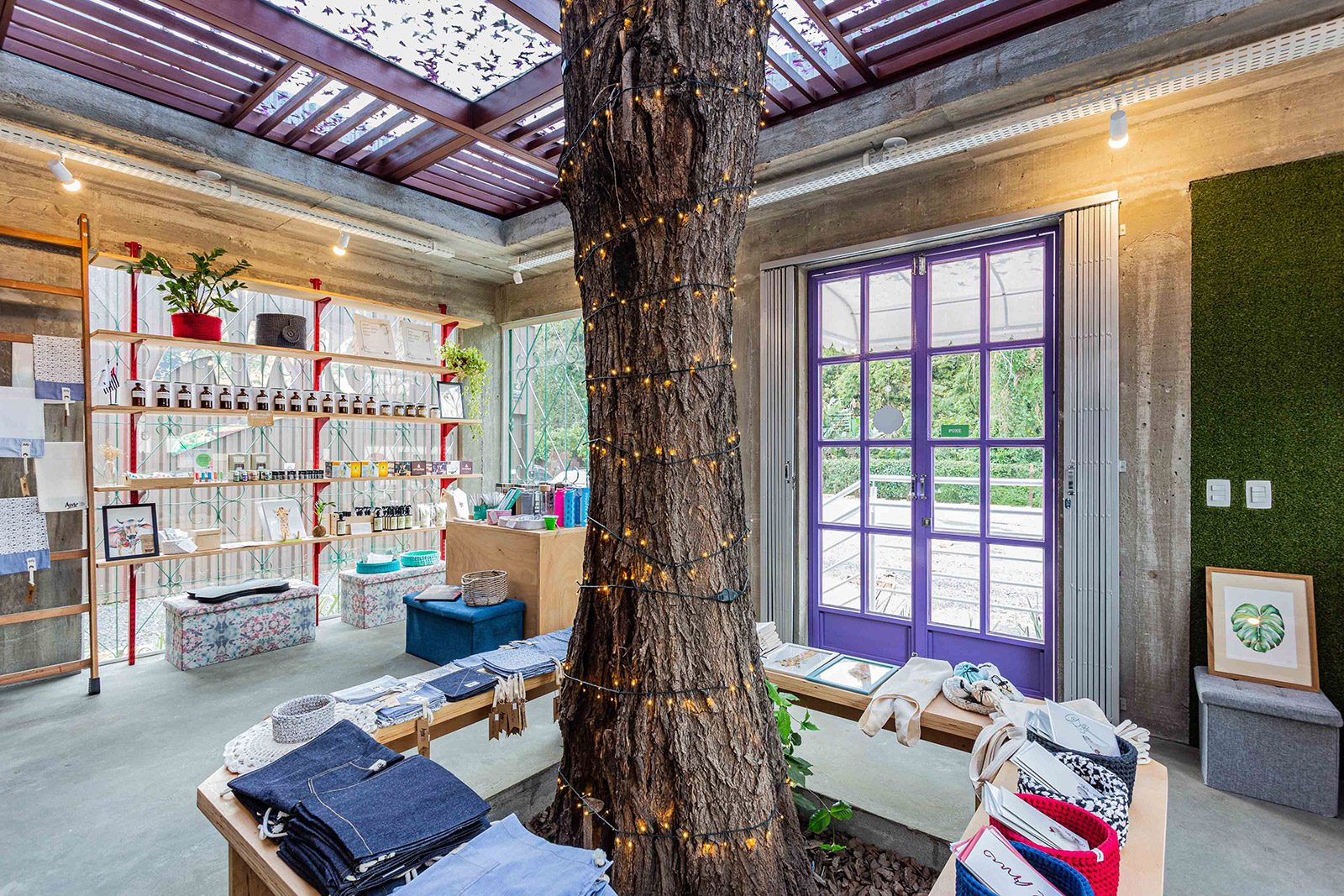 Destaque para o teto em vidro que permite a entrada do sol e a passagem do Ipê (preservado há mais de 20 anos no local), trazendo assim a natureza para o interior da loja.