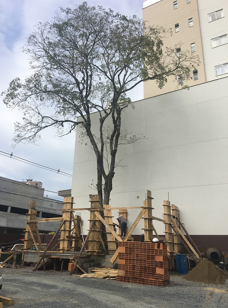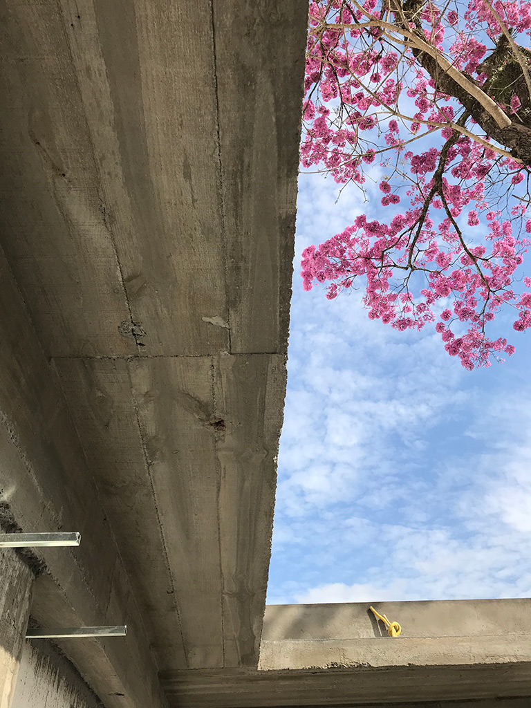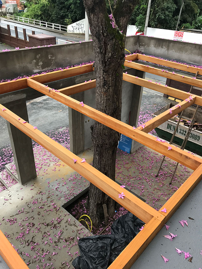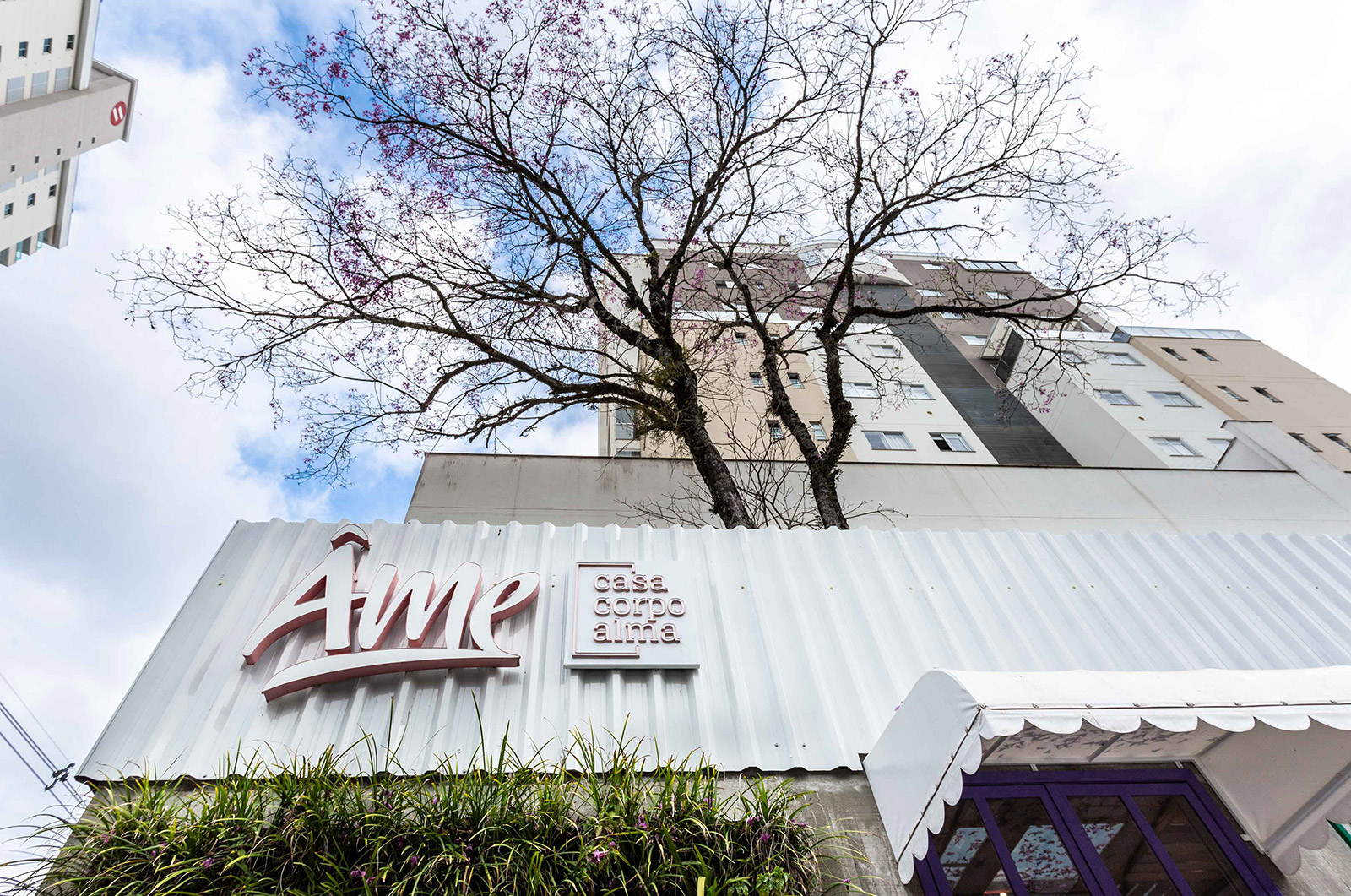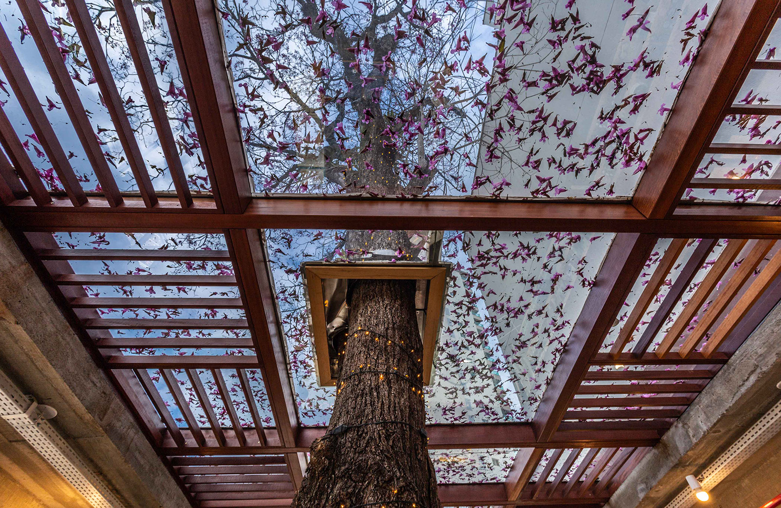 Destaque para o teto em vidro que permite a entrada do sol e a passagem do Ipê (preservado há mais de 20 anos no local), trazendo assim a natureza para o interior da loja.