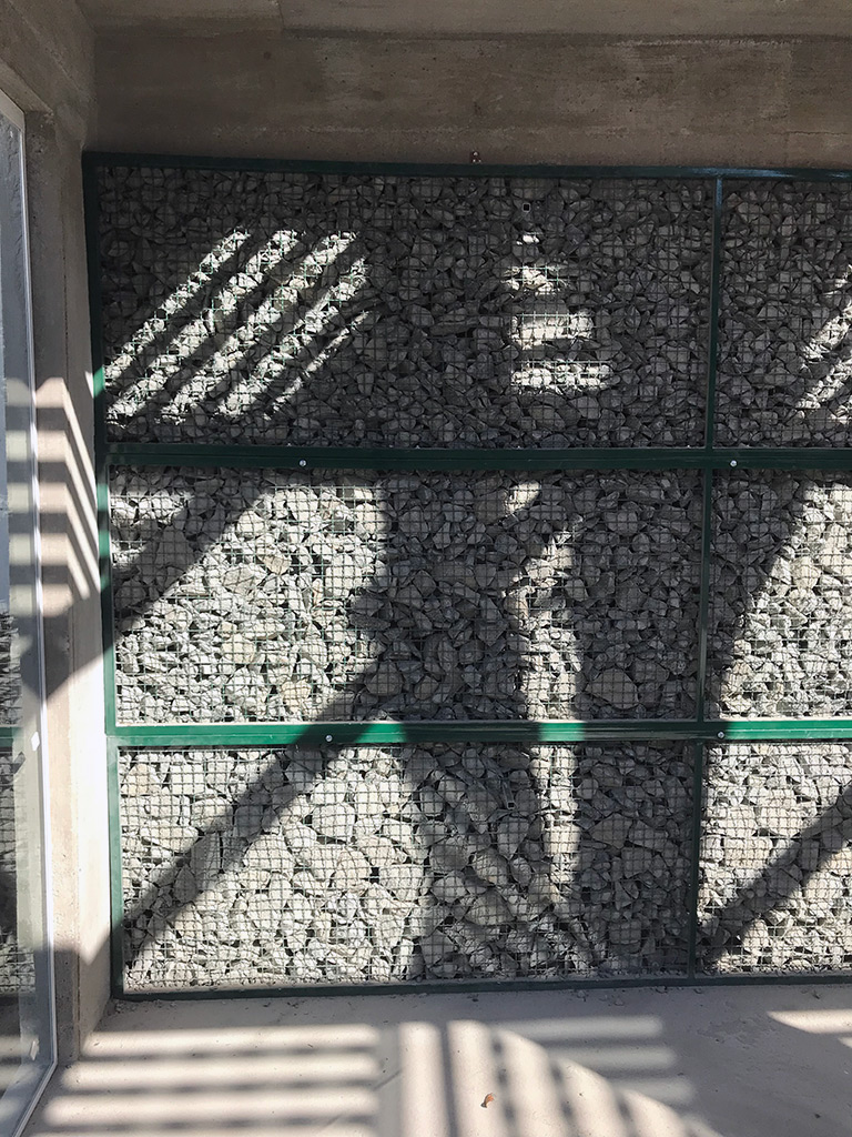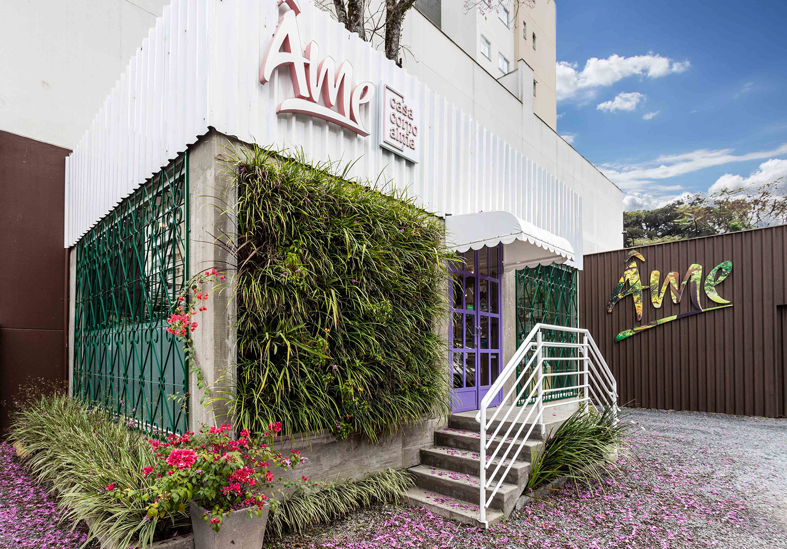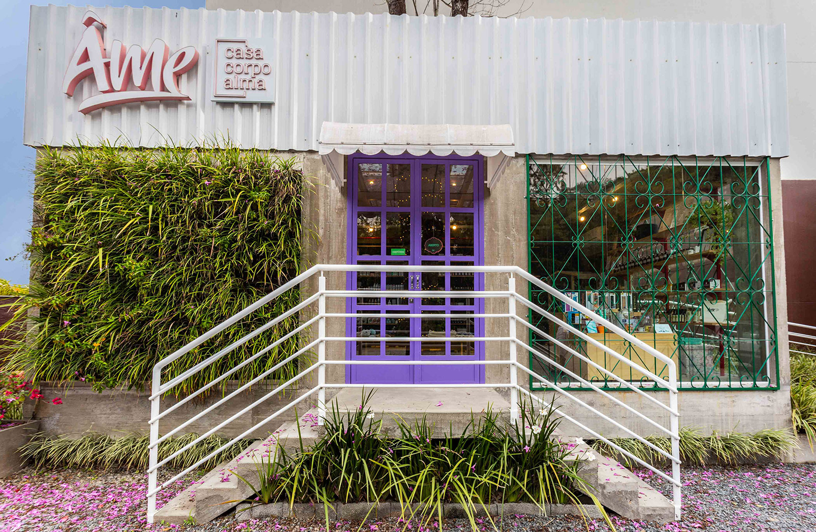 Os materiais utilizados foram mantidos em sua forma mais “crua”, como a estrutura da construção, o piso em concreto aparente e o muro gabião. Bem como a fachada, com fechamento em telha e uma parede verde na entrada principal.