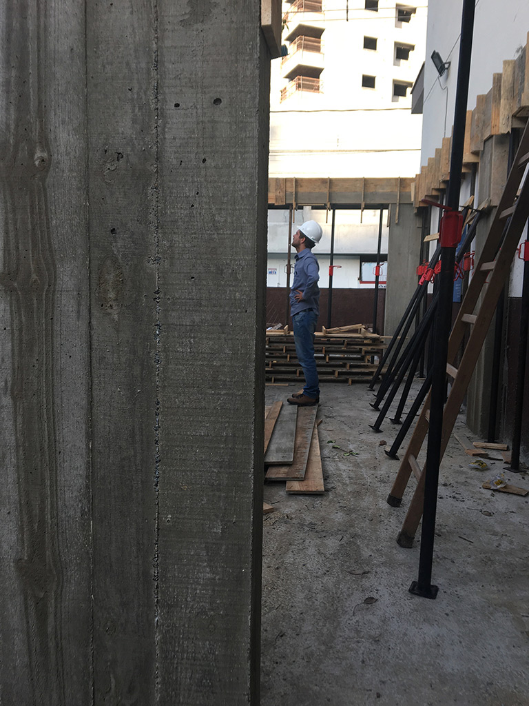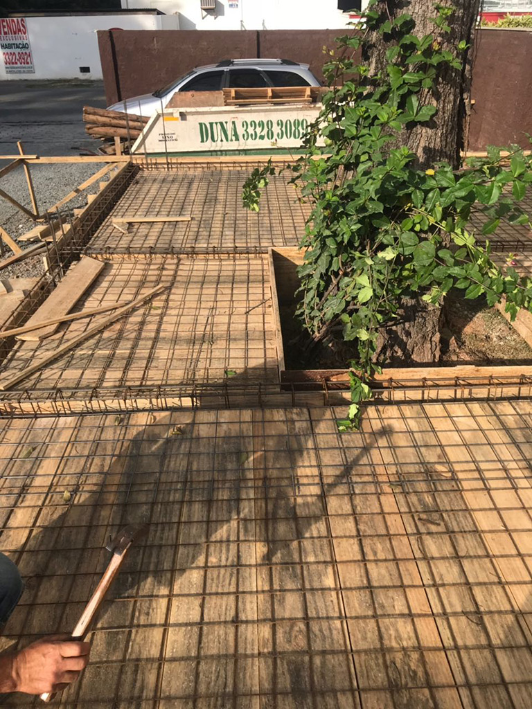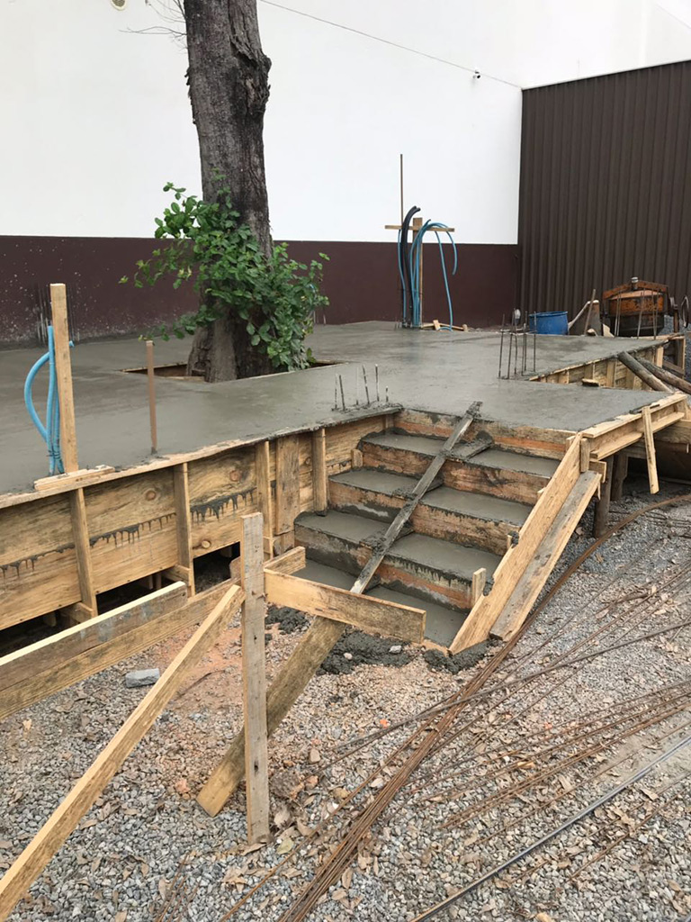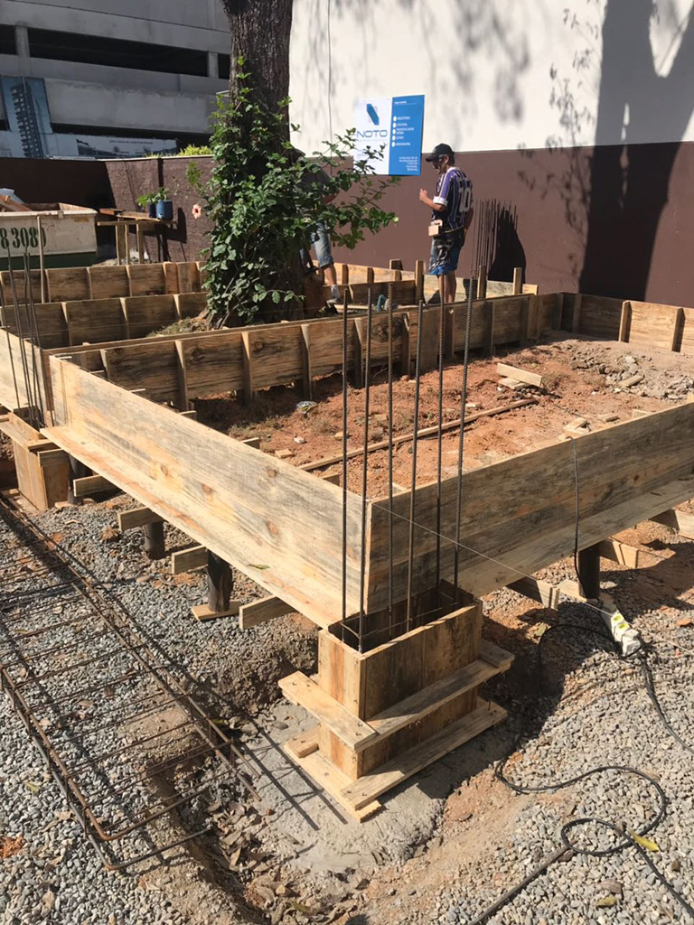 Os materiais utilizados foram mantidos em sua forma mais “crua”, como a estrutura da construção, o piso em concreto aparente e o muro gabião. Bem como a fachada, com fechamento em telha e uma parede verde na entrada principal.