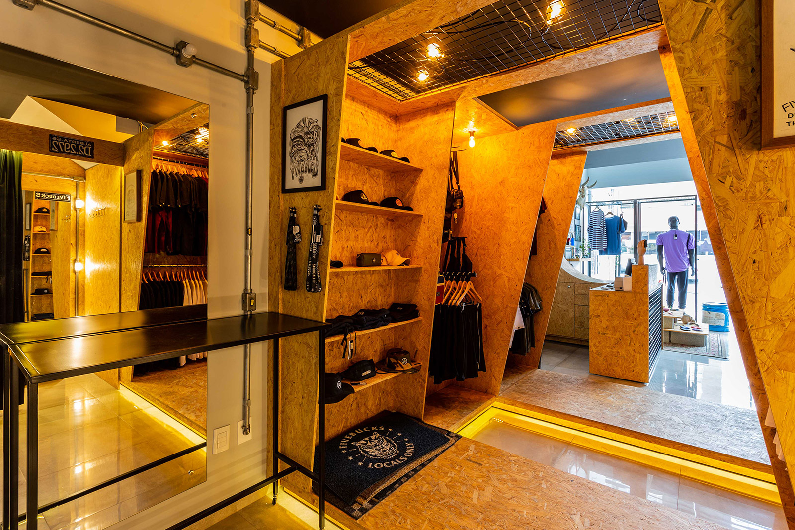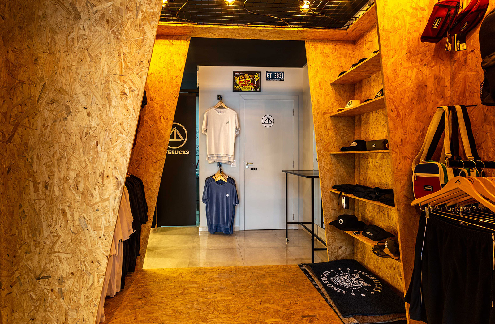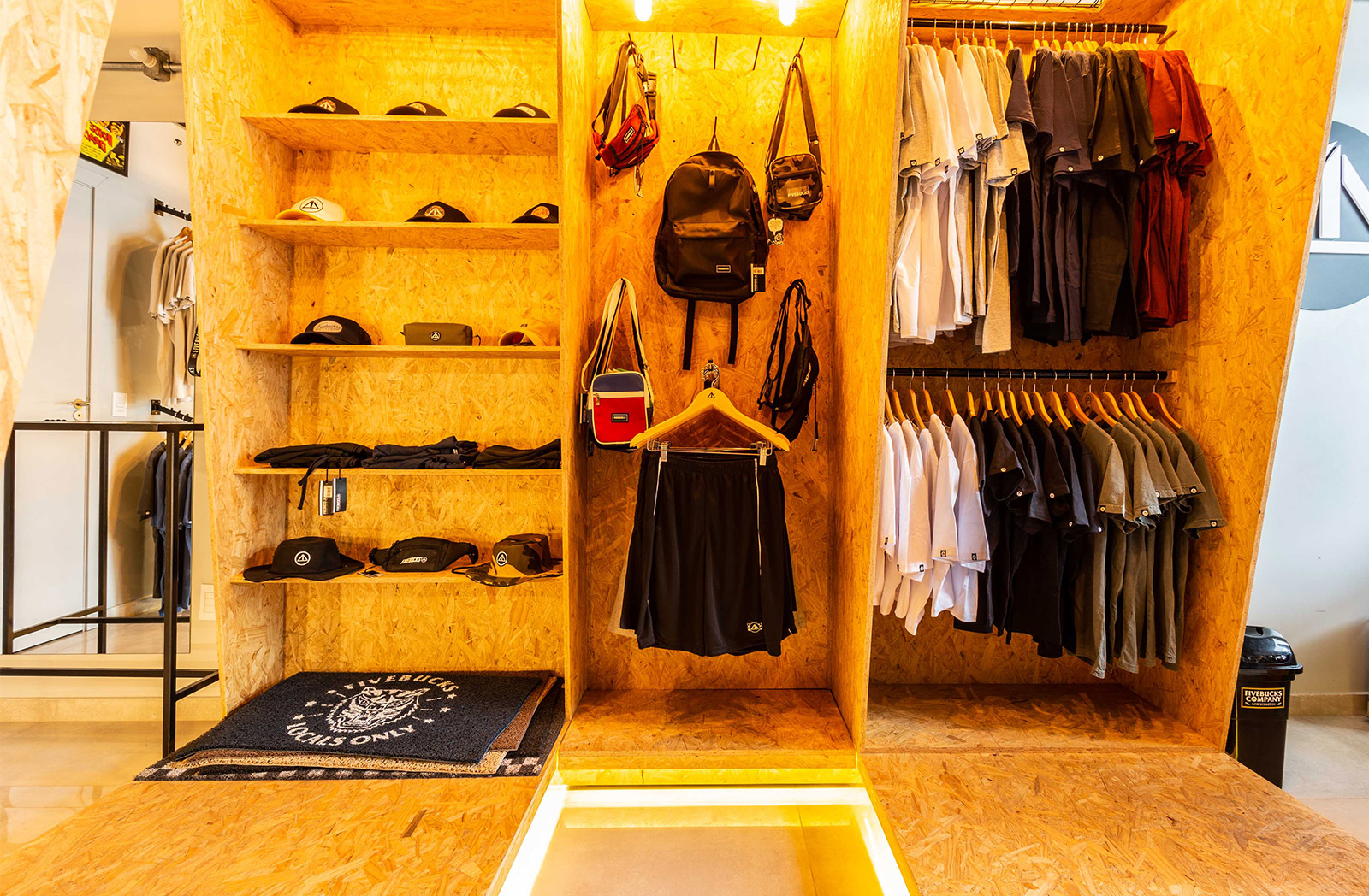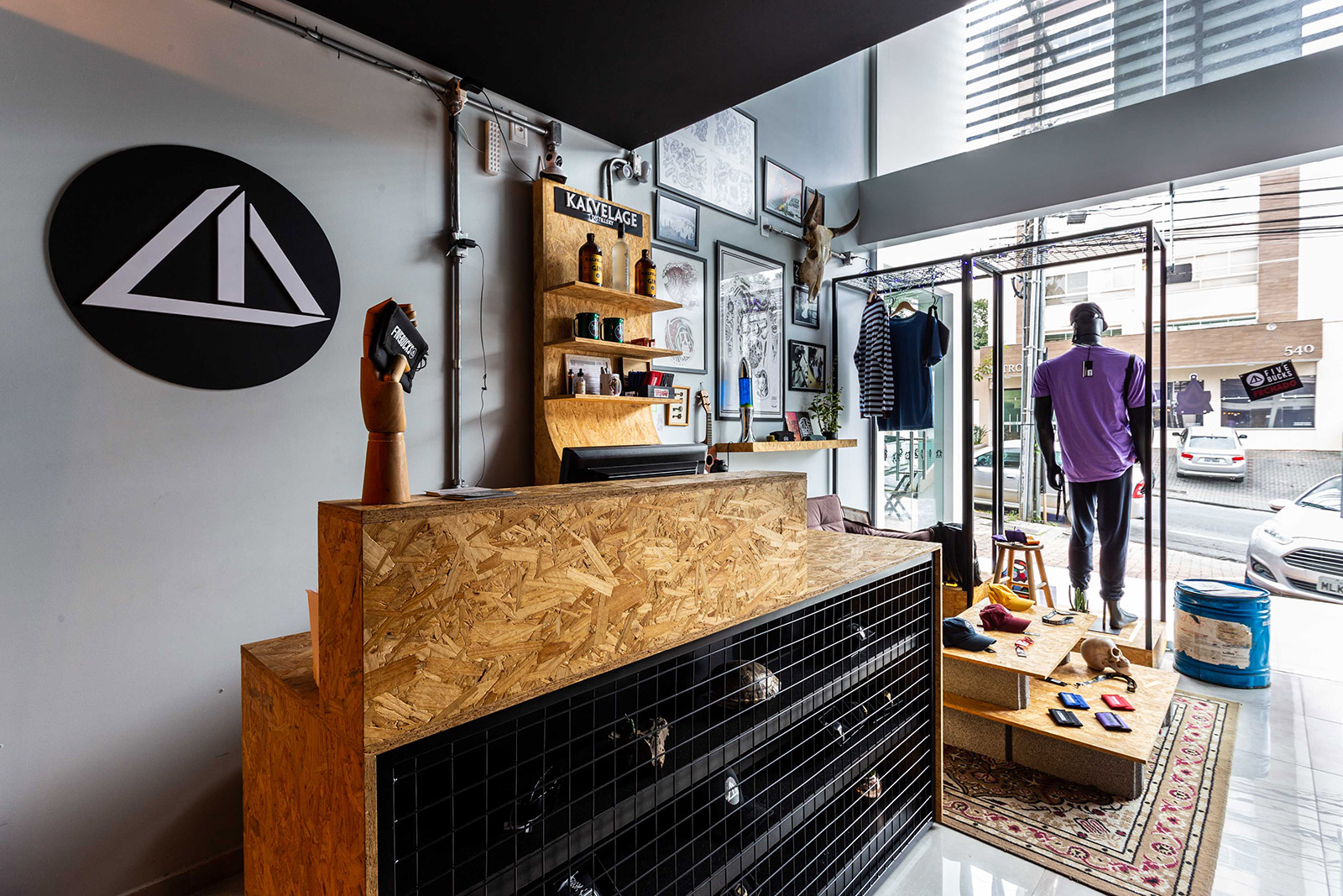 Com uma estética “street”: gradis nos expositores, fiações propositalmente aparentes e correntes para delimitar o estoque, encaixamos espaço de loja, provadores, copa, mobiliário, vitrine e ainda um lounge para os clientes.