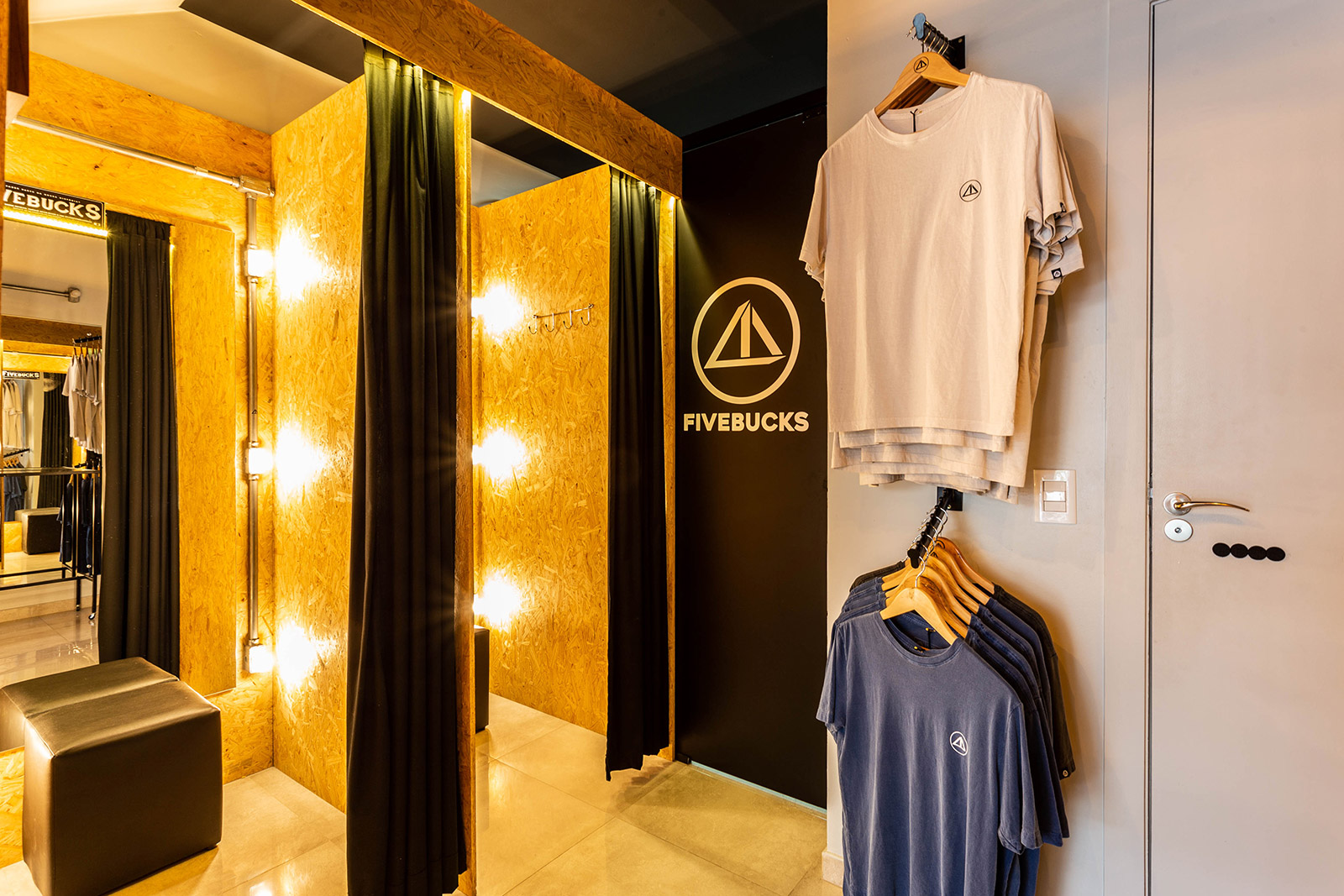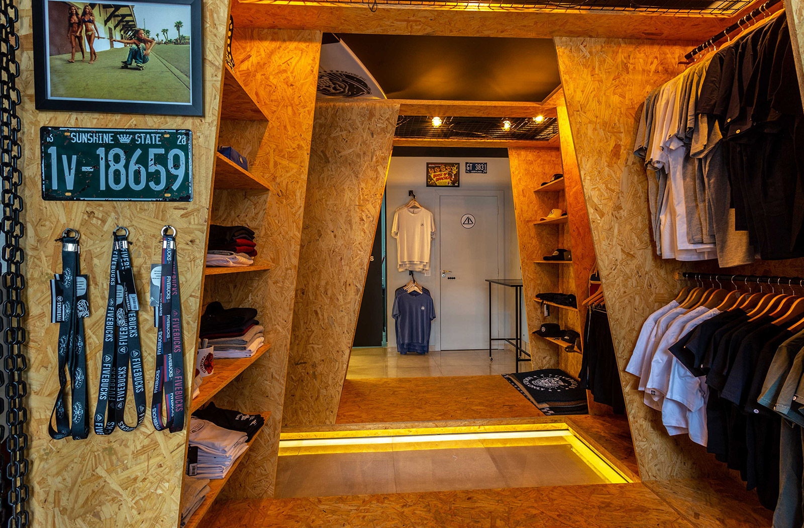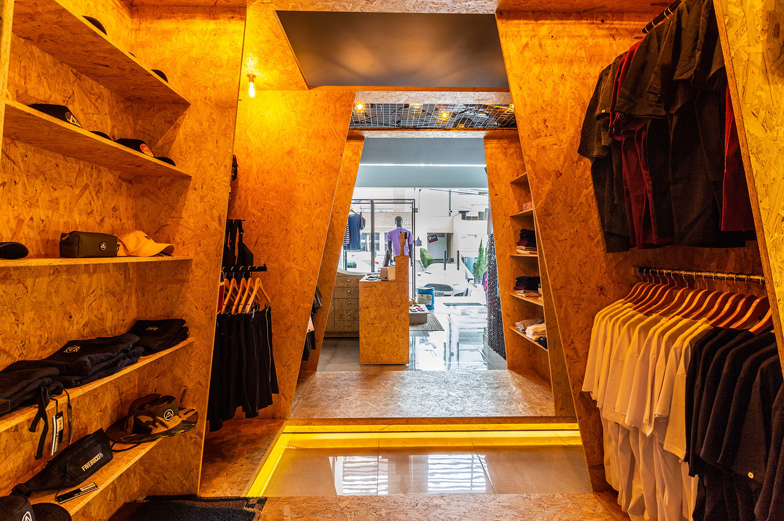 Com uma estética “street”: gradis nos expositores, fiações propositalmente aparentes e correntes para delimitar o estoque, encaixamos espaço de loja, provadores, copa, mobiliário, vitrine e ainda um lounge para os clientes.