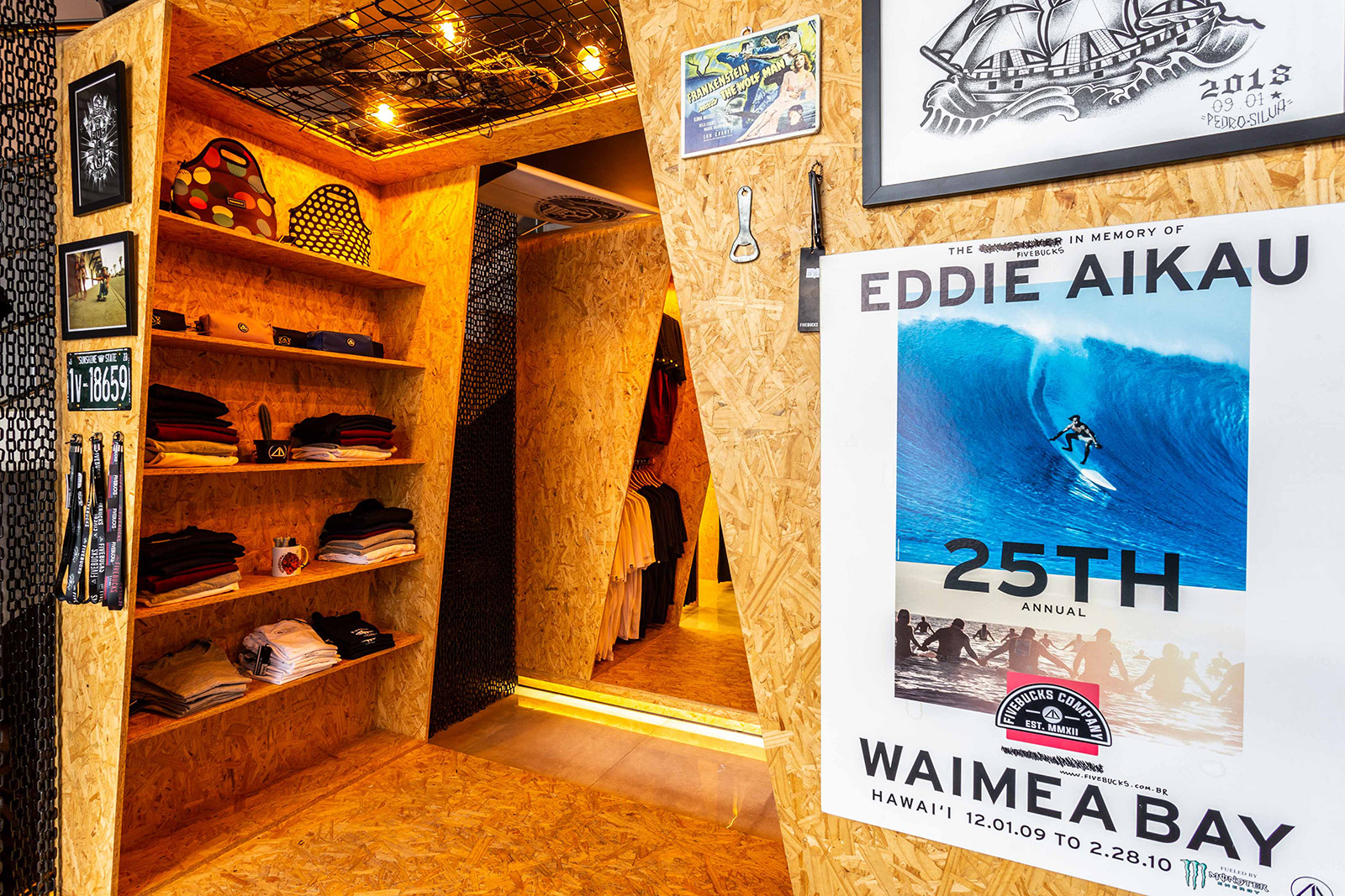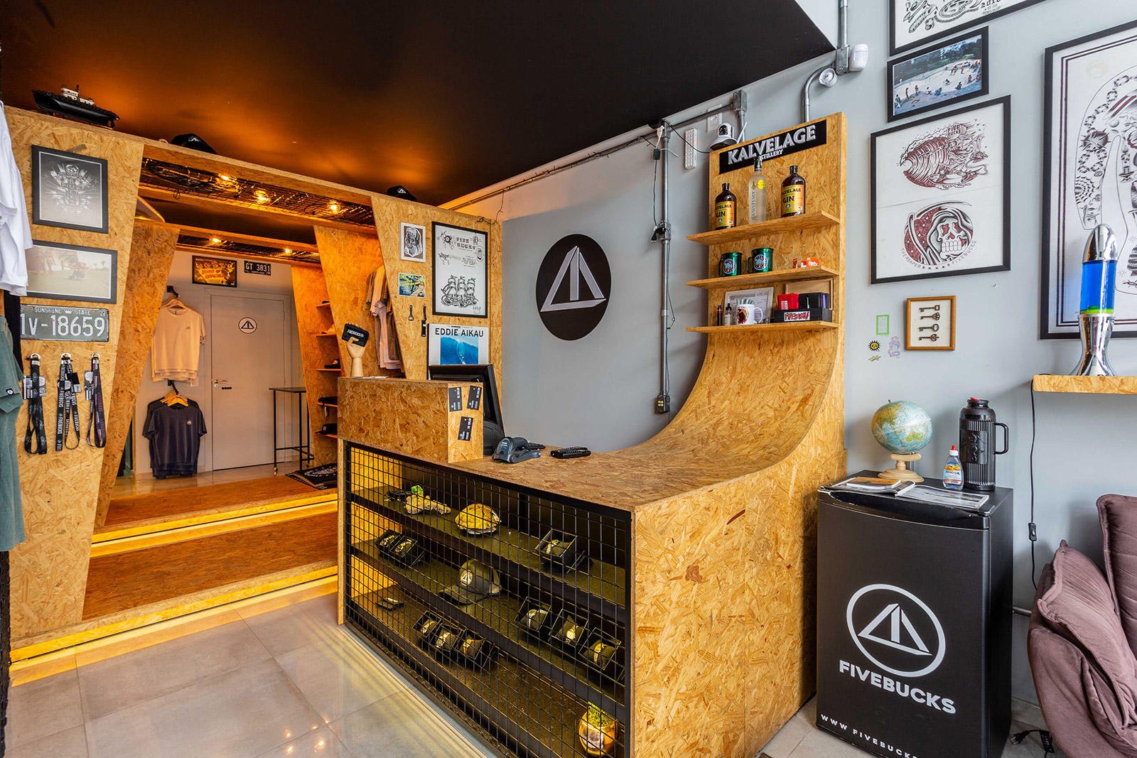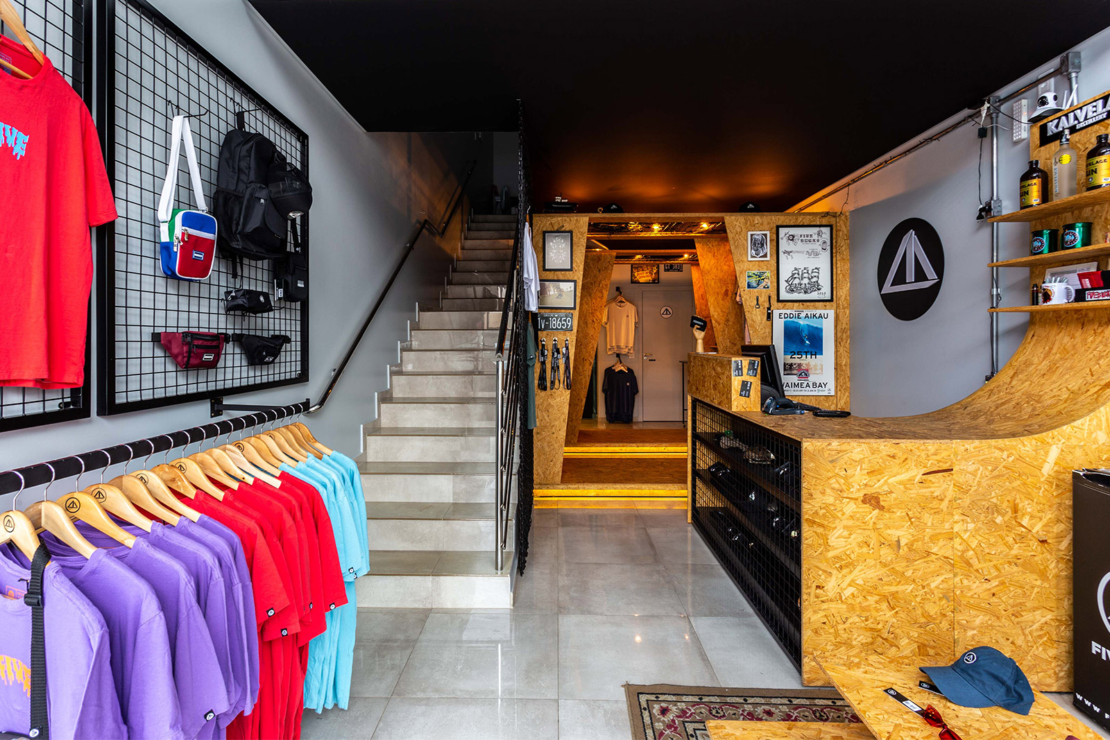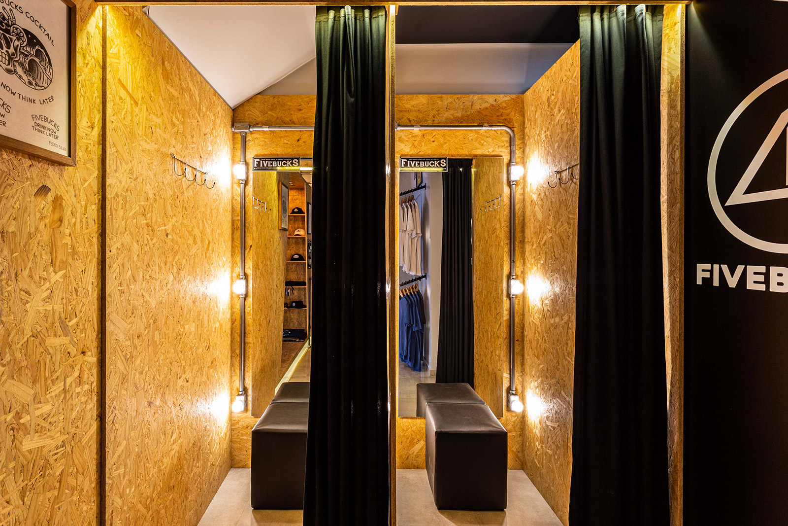 Com uma estética “street”: gradis nos expositores, fiações propositalmente aparentes e correntes para delimitar o estoque, encaixamos espaço de loja, provadores, copa, mobiliário, vitrine e ainda um lounge para os clientes.
