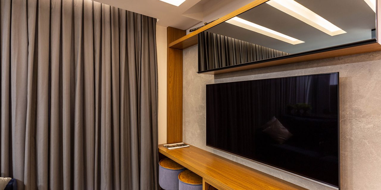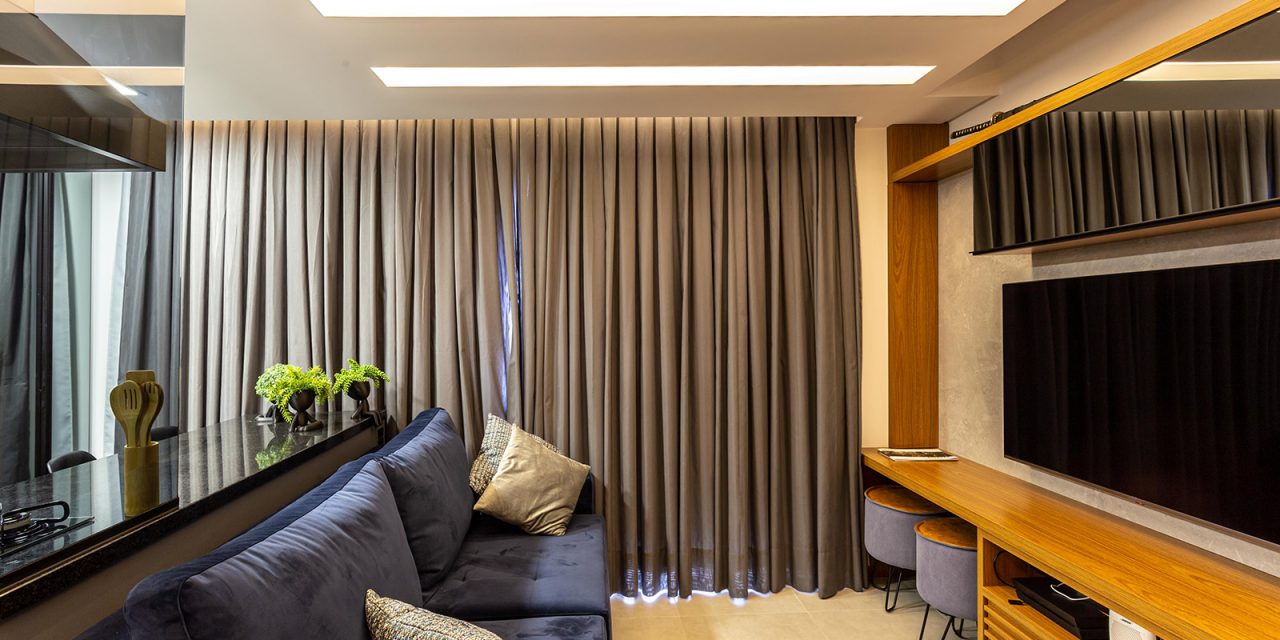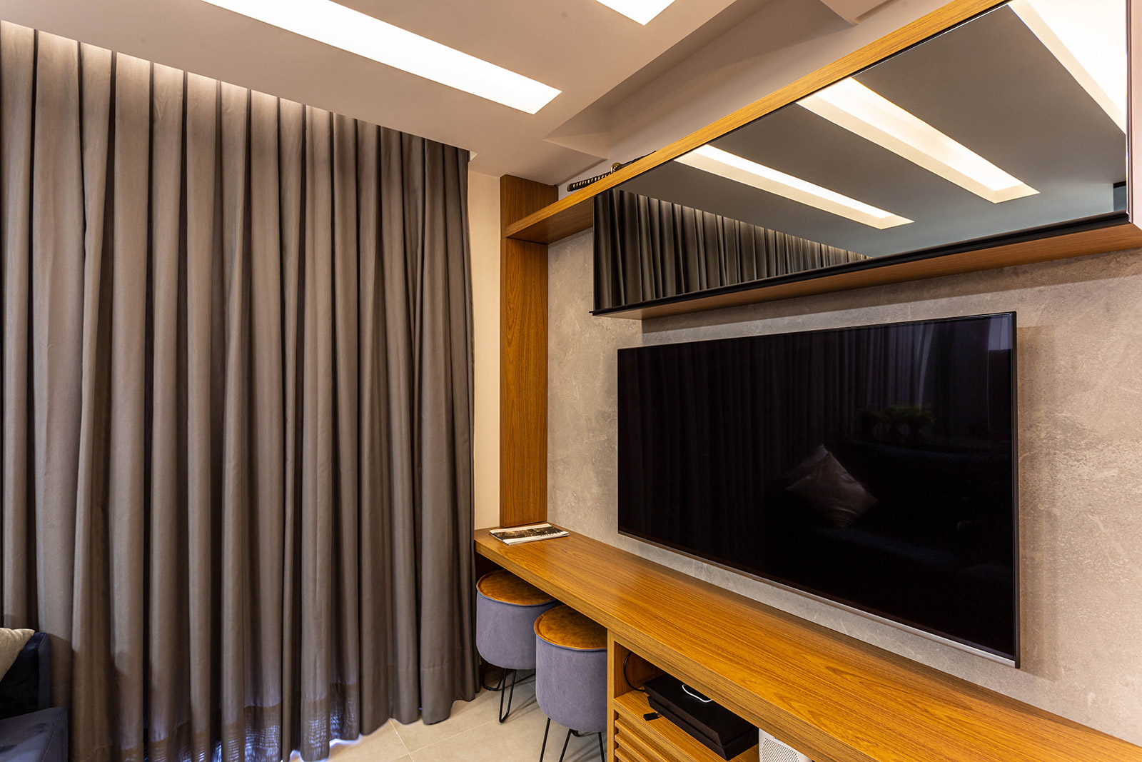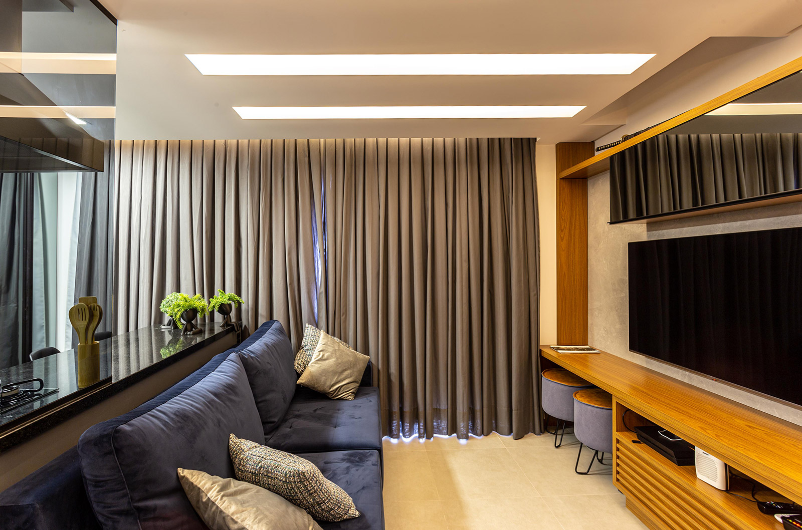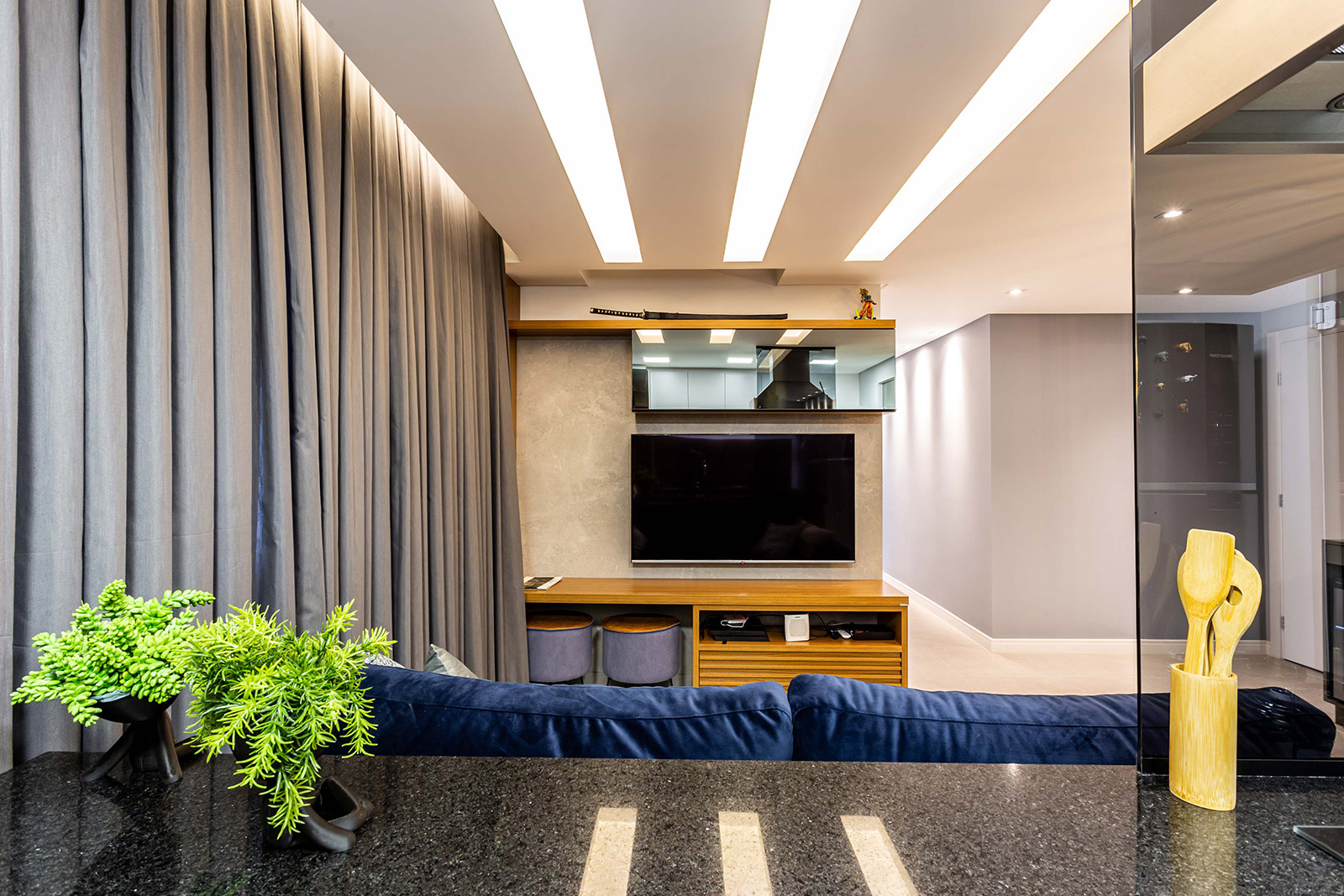 Com visão para a televisão, aproveitamos a disposição do projeto para criar uma área de lanches rápidos próxima à janela.