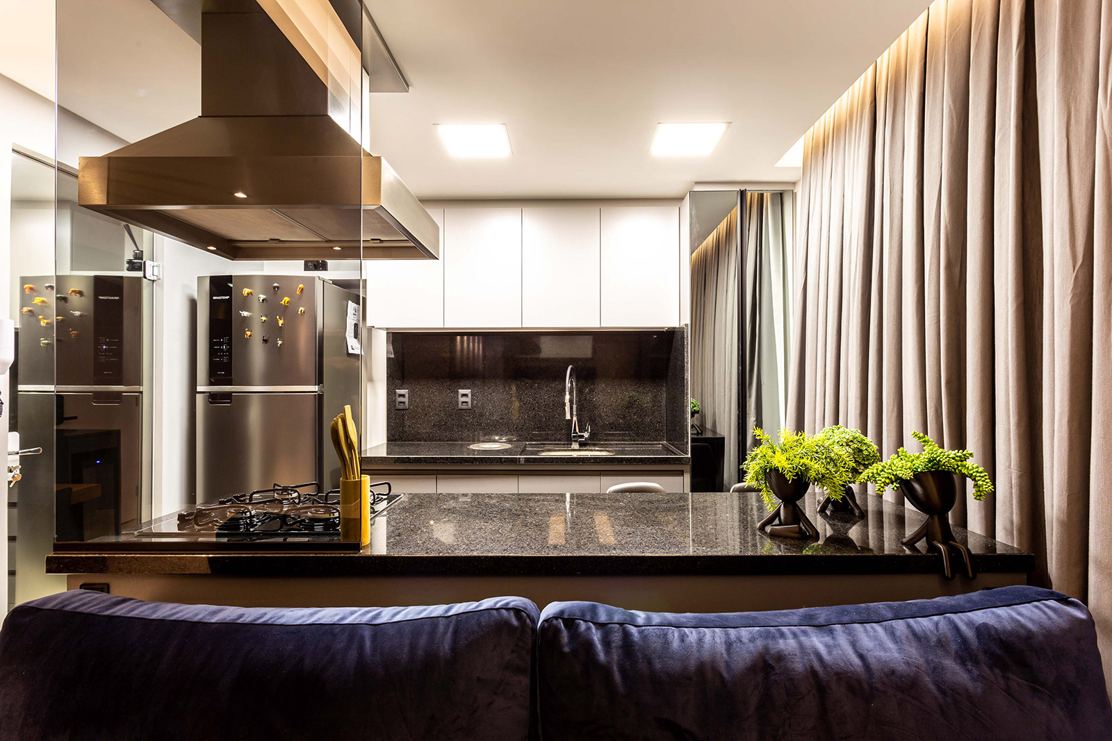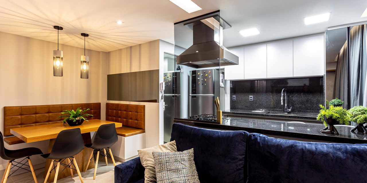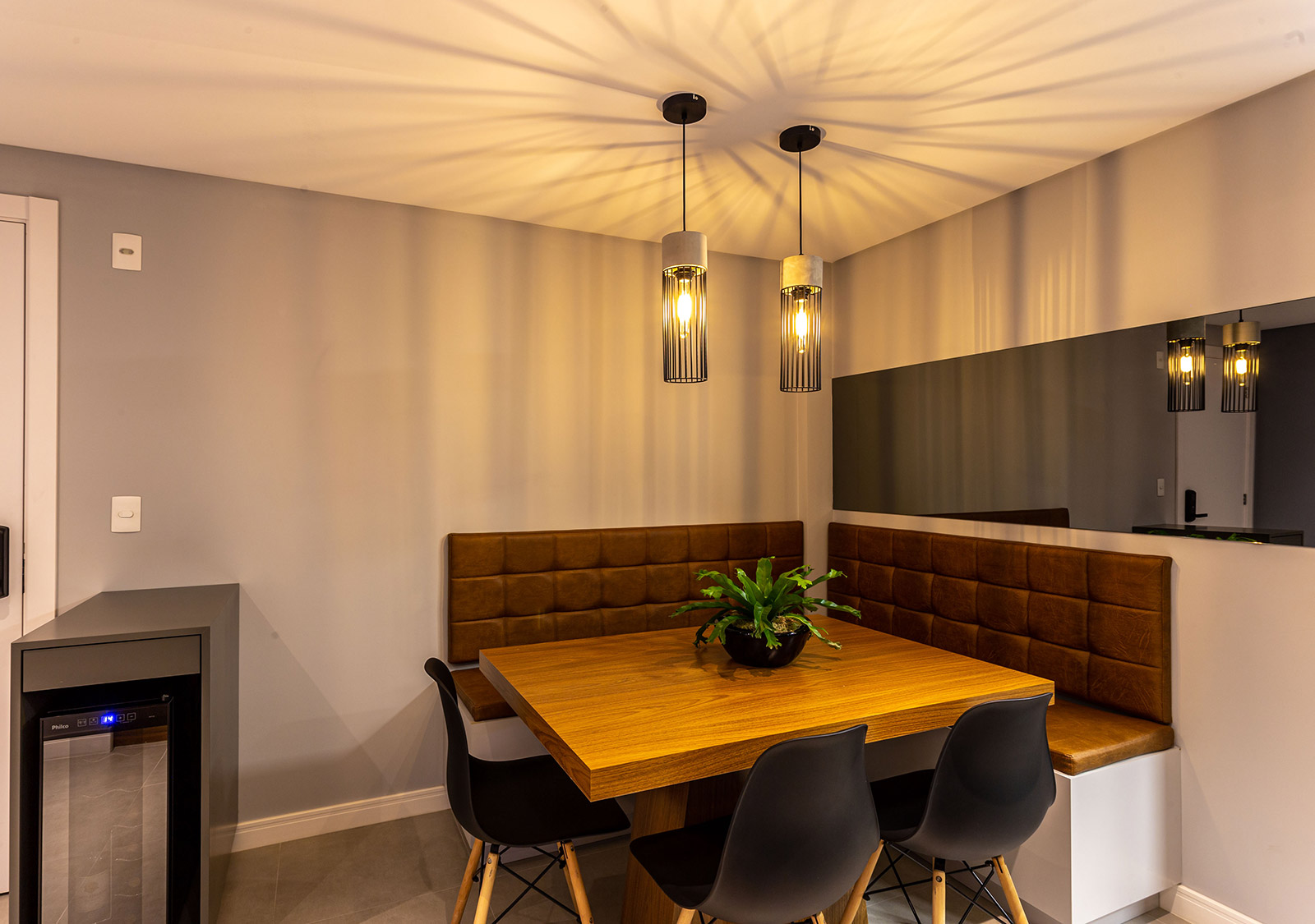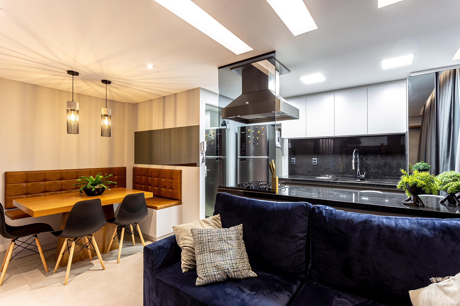 A necessidade de entregar um espaço mais funcional trouxe para a sala um canto alemão moderno, com armário dentro dos bancos. Além de uma ilha na cozinha, delimitando cada área e ampliando o espaço de bancada, enquanto o vidro serve de proteção para o sofá.