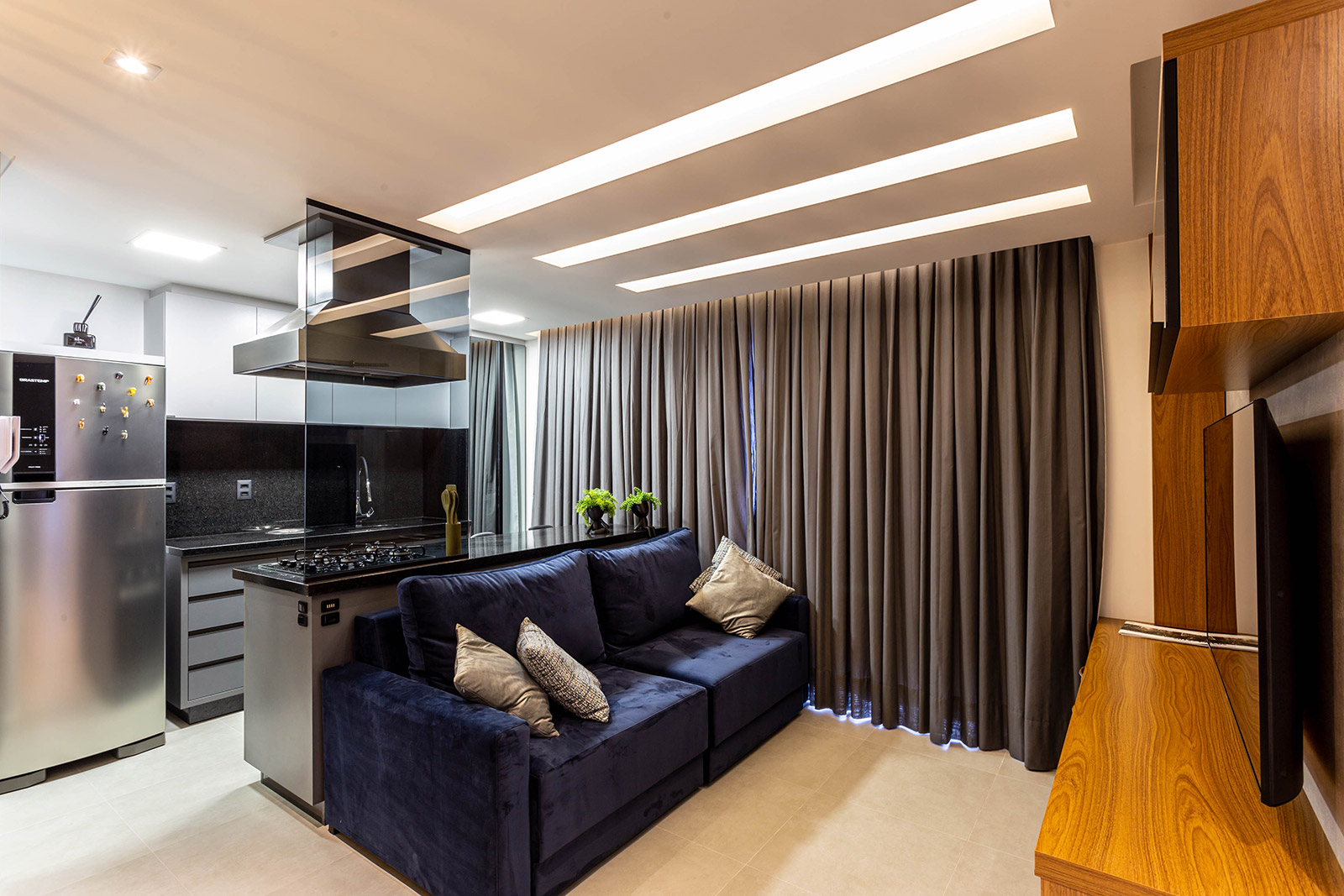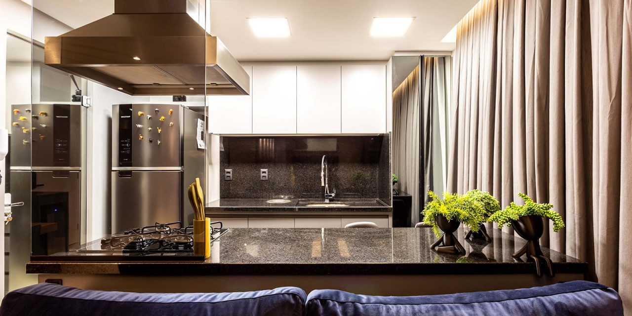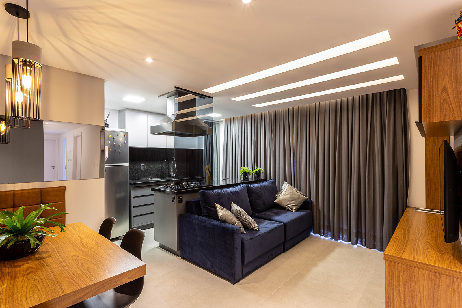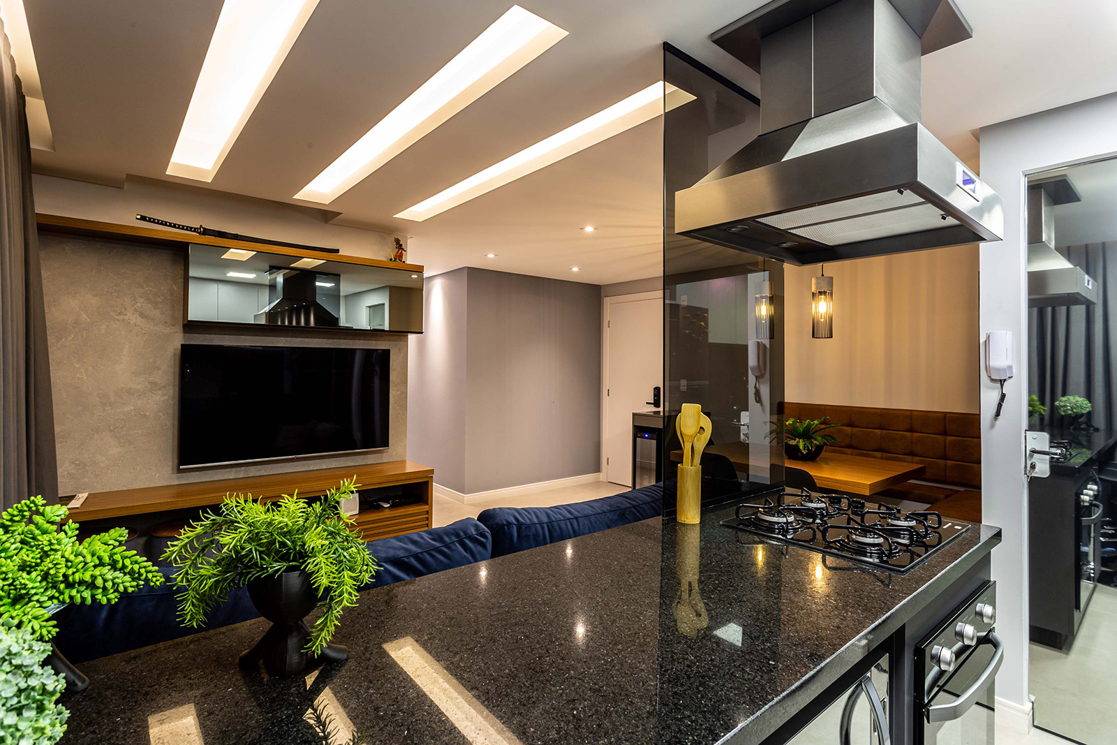 A necessidade de entregar um espaço mais funcional trouxe para a sala um canto alemão moderno, com armário dentro dos bancos. Além de uma ilha na cozinha, delimitando cada área e ampliando o espaço de bancada, enquanto o vidro serve de proteção para o sofá.