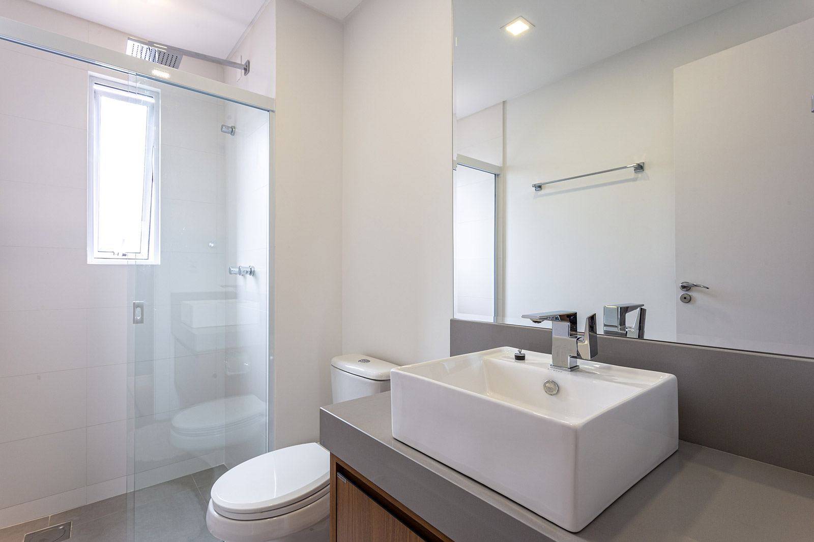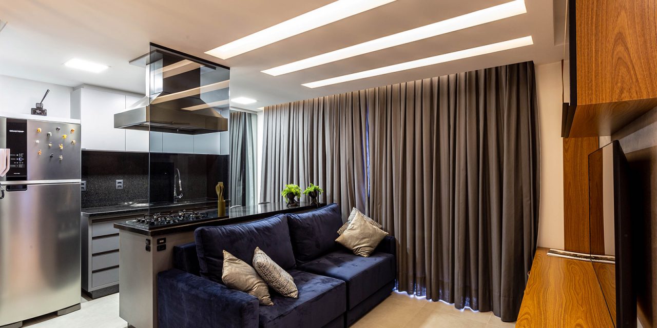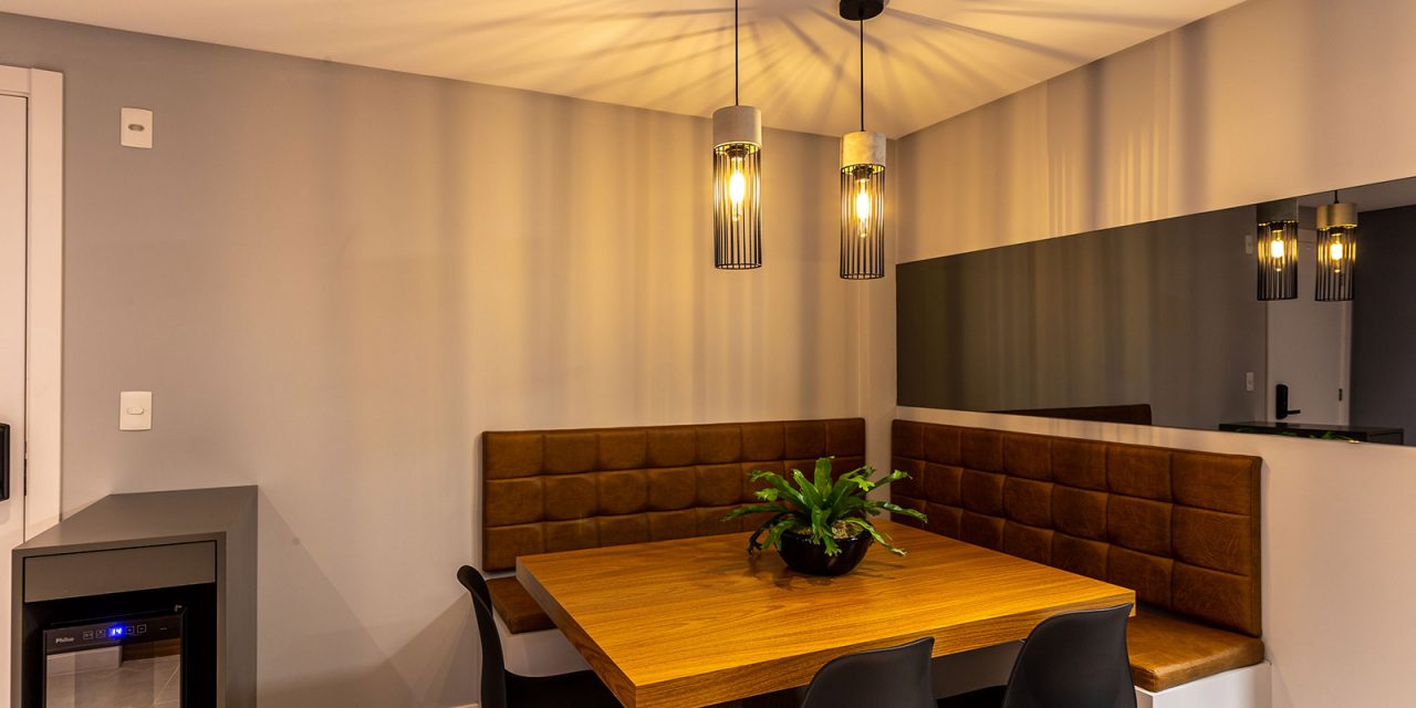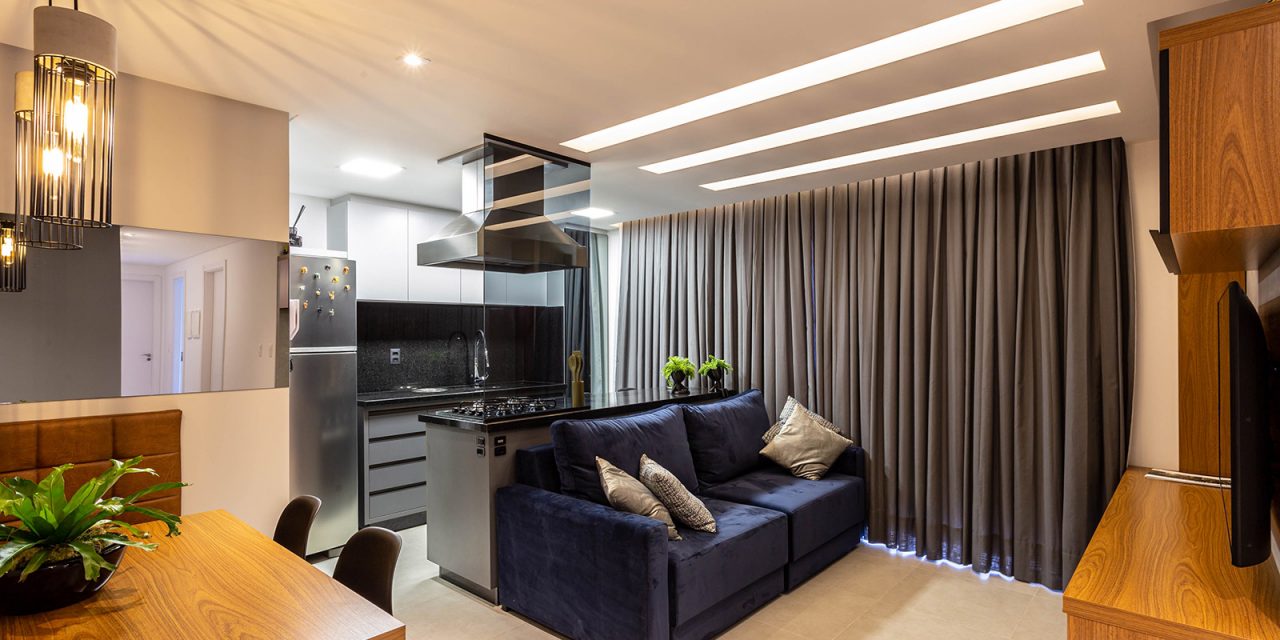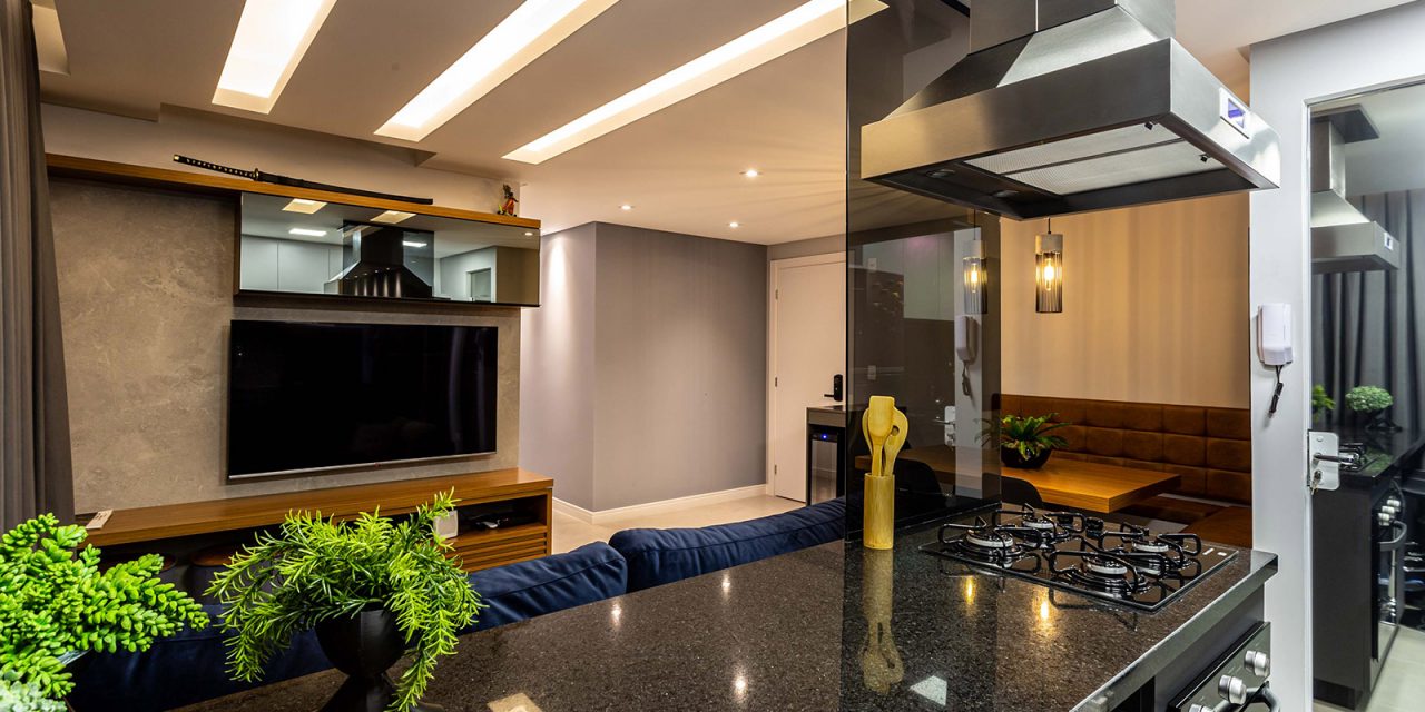 A necessidade de entregar um espaço mais funcional trouxe para a sala um canto alemão moderno, com armário dentro dos bancos. Além de uma ilha na cozinha, delimitando cada área e ampliando o espaço de bancada, enquanto o vidro serve de proteção para o sofá.