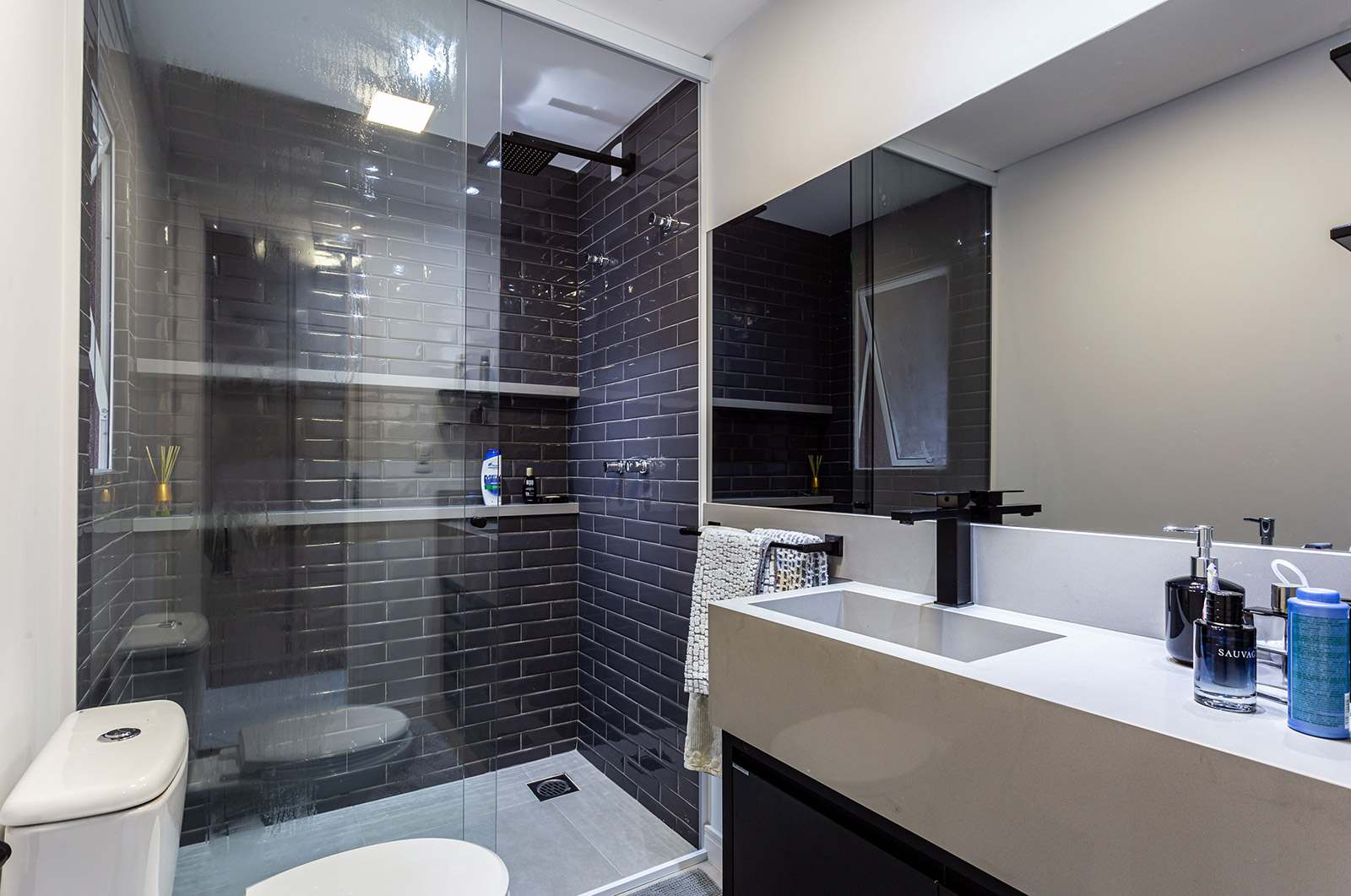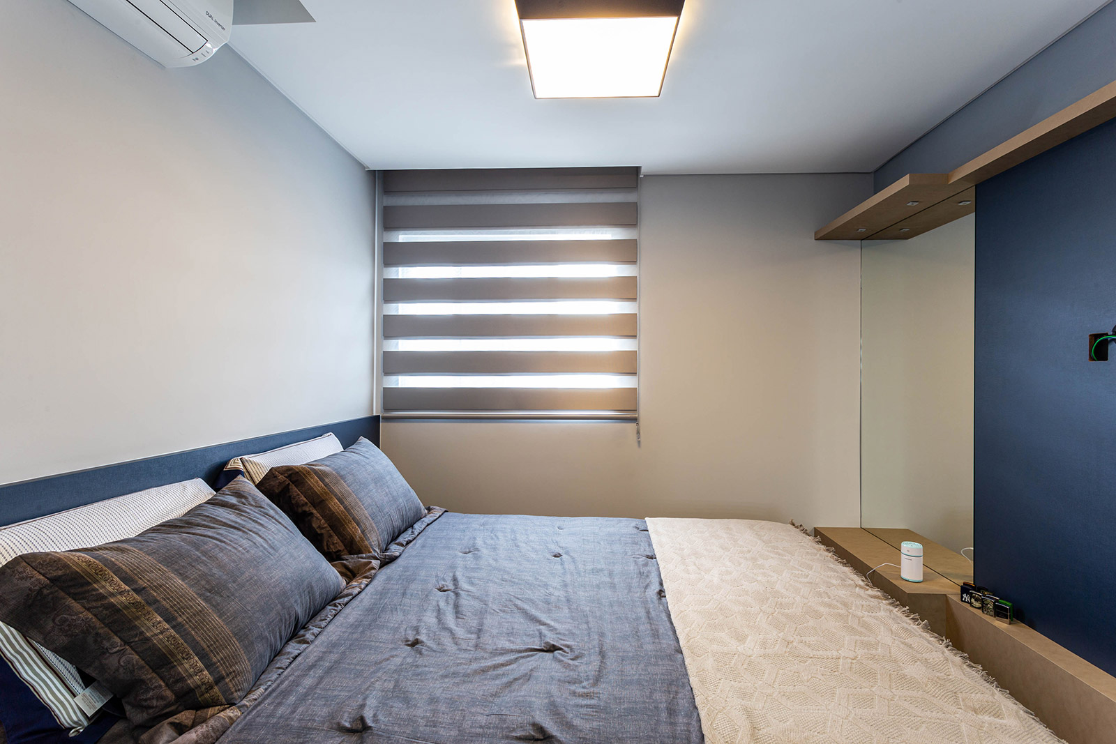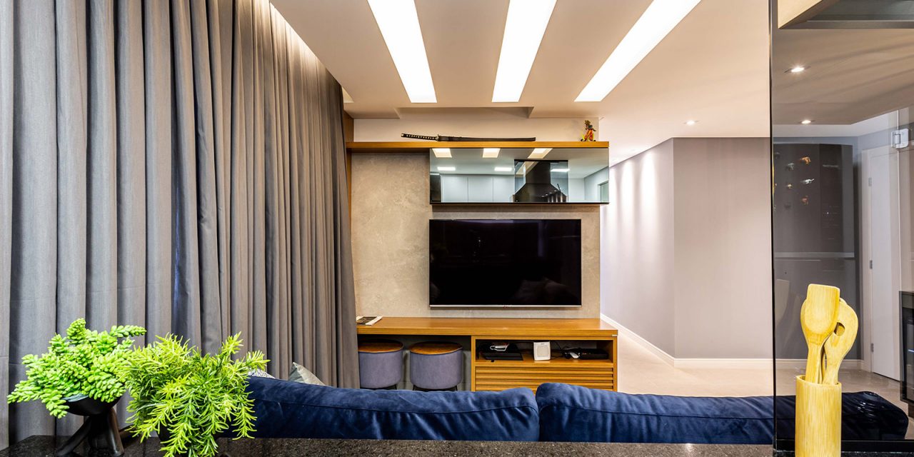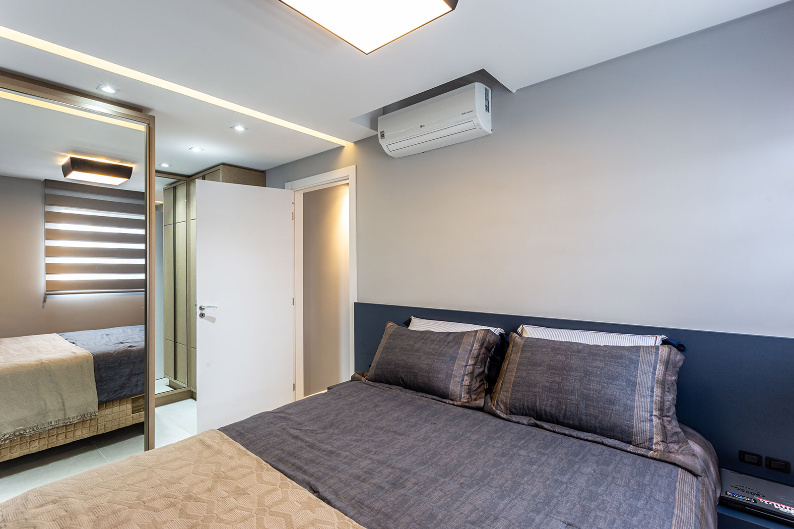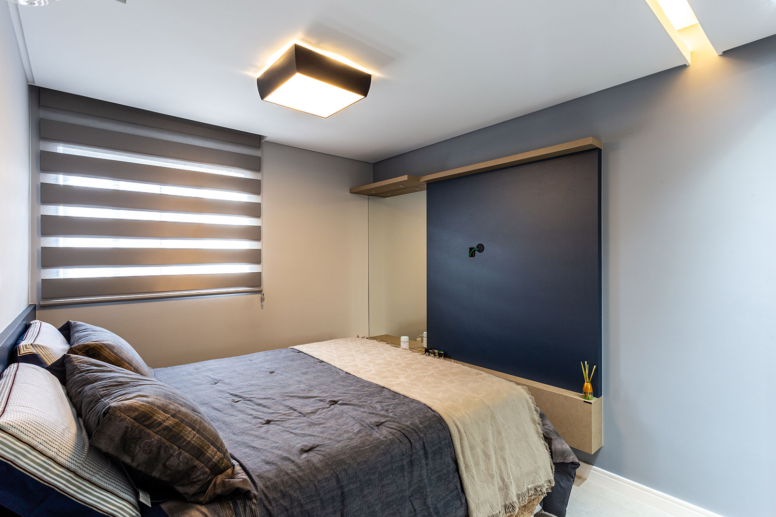 Para refletir o estilo e a personalidade do cliente, agregamos elementos acolhedores, como lâminas de madeira e camurça, aos tons de azul e cinza que são mais sóbrios.